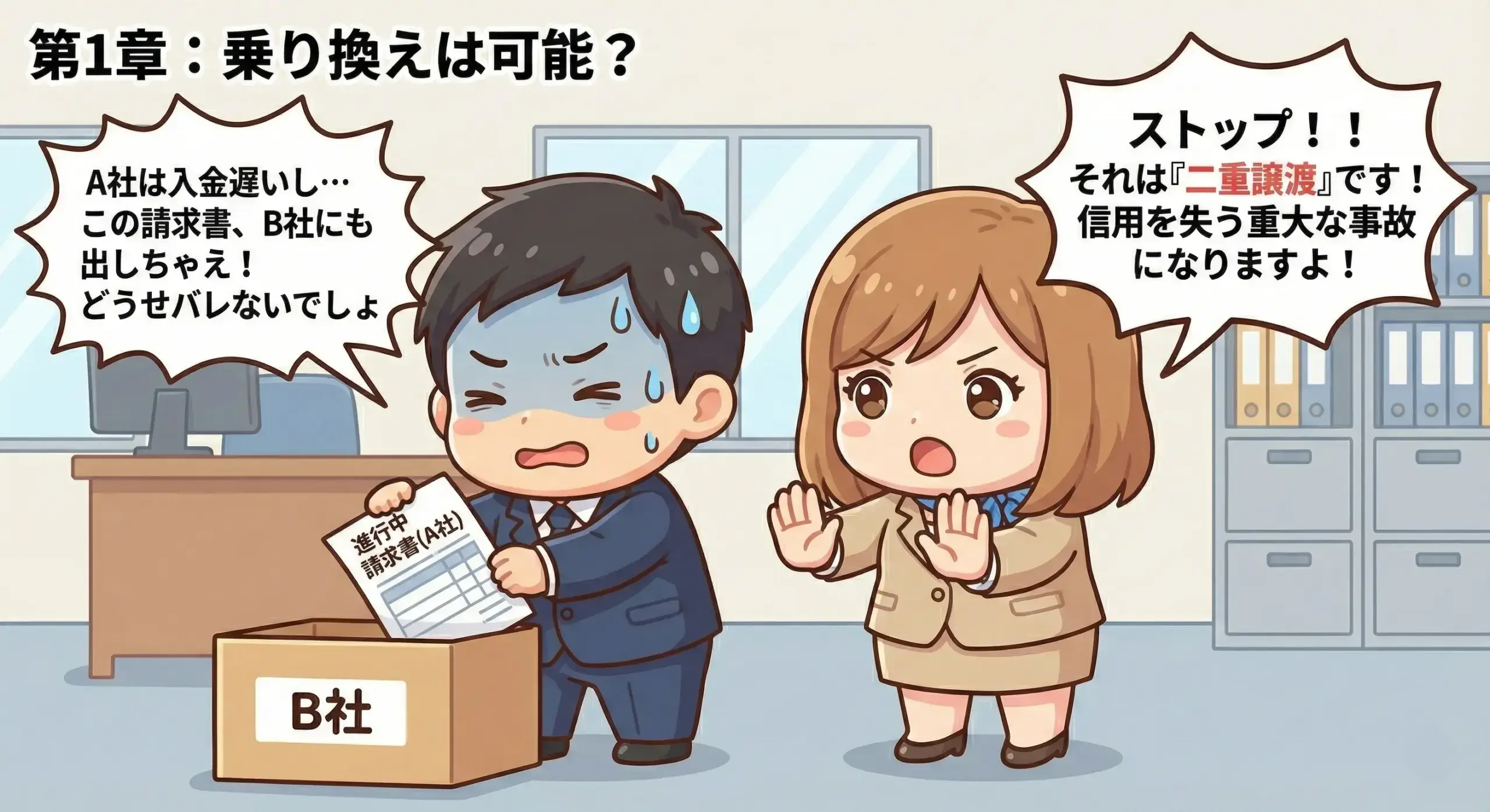 - 「同じ請求書を差し替える」形の乗り換えは危険(=二重譲渡のリスク)